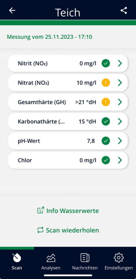 Bei unseren eigenen Messungen mit Messstäbchen haben wir gute Werte für Teichwasser gemessen.